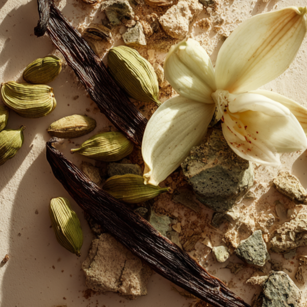 Połączenie aksamitnej wanilii i głębokiego kardamonu tworzy intensywny, słodko-korzenny zapach o lekkiej pikantności, kompozycja długo utrzymuje się na skórze, dając poczucie ciepła, elegancji i wyrafinowanej przyjemności.